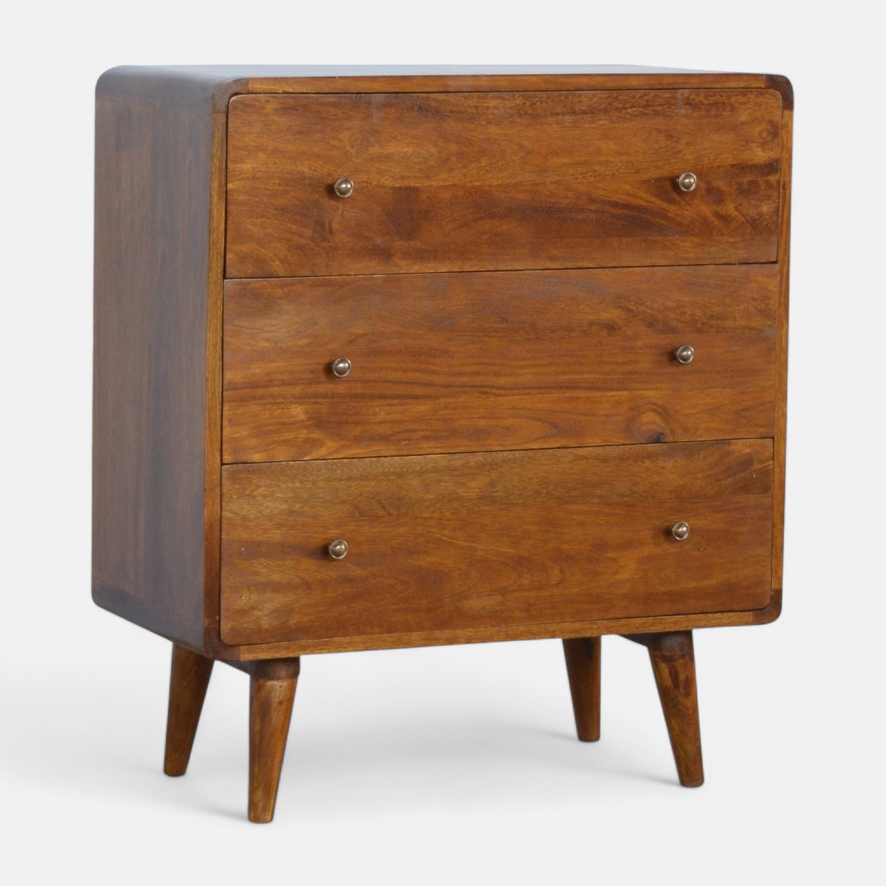To match the other products from the curved collection, this chest of drawers has been constructed from 100% solid mango wood in a rich chestnut finish and stands on 4 Nordic style legs. It features shiny accent knobs on each drawer providing easy access when storing any clothes, towels, duvets, etc. The curved design provides smooth, safe corners and gives the product a modern and contemporary look which is perfect for city homes and apartments.