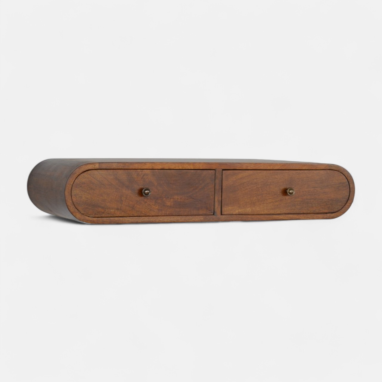 This curved wall-mounted console table is the perfect way to save space and avoid the hassle of legs in the home. Constructed from 100% solid mango wood it has a chestnut finish and great storage options with 2 drawers and ample space on top for ornaments, plants, or books. Use alone or with the rest of the curved chestnut collection.