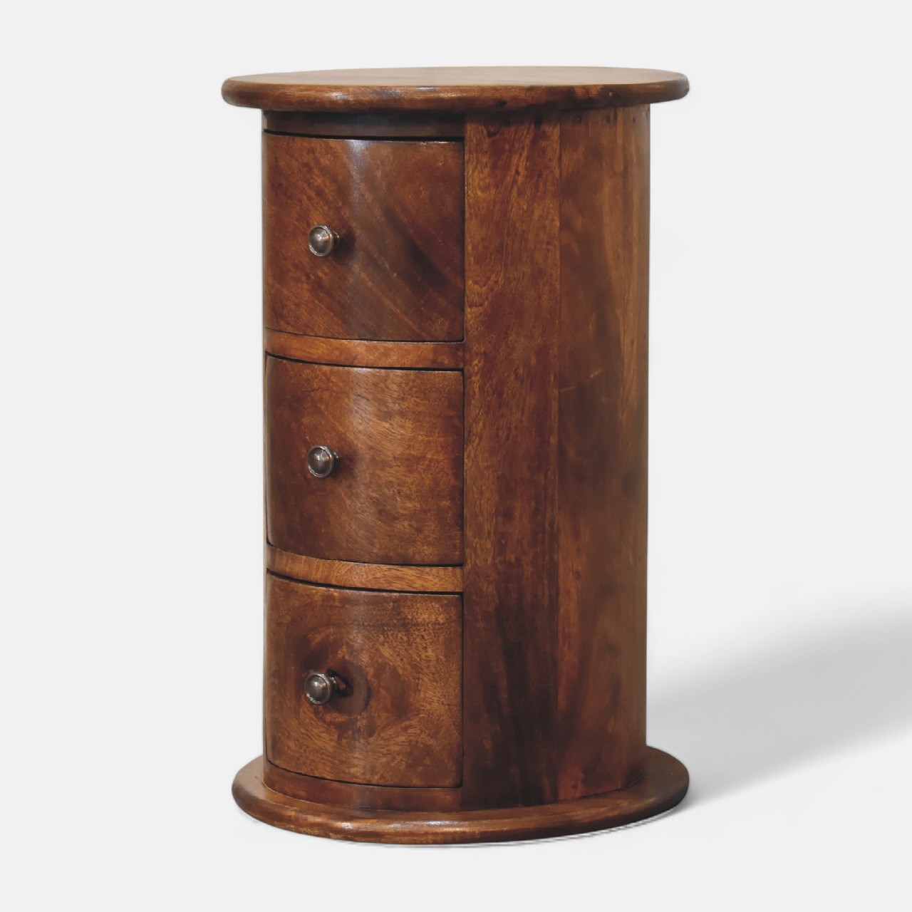 This beautiful mini round three drawer country-style drum chest is made from 100% solid mango wood and has a fine chestnut finish with shiny knobs on the drawers. The piece is perfect for storing small items like keys, loose change and has space on top for displaying photos, ornaments, and collectibles. This petite product can be used as either a bedside table, end table, or an occasional table. Every piece of furniture is individually handcrafted and includes swing care tickets explaining the cautions and aftercare instructions. This petite product is part of Recession Collection.
