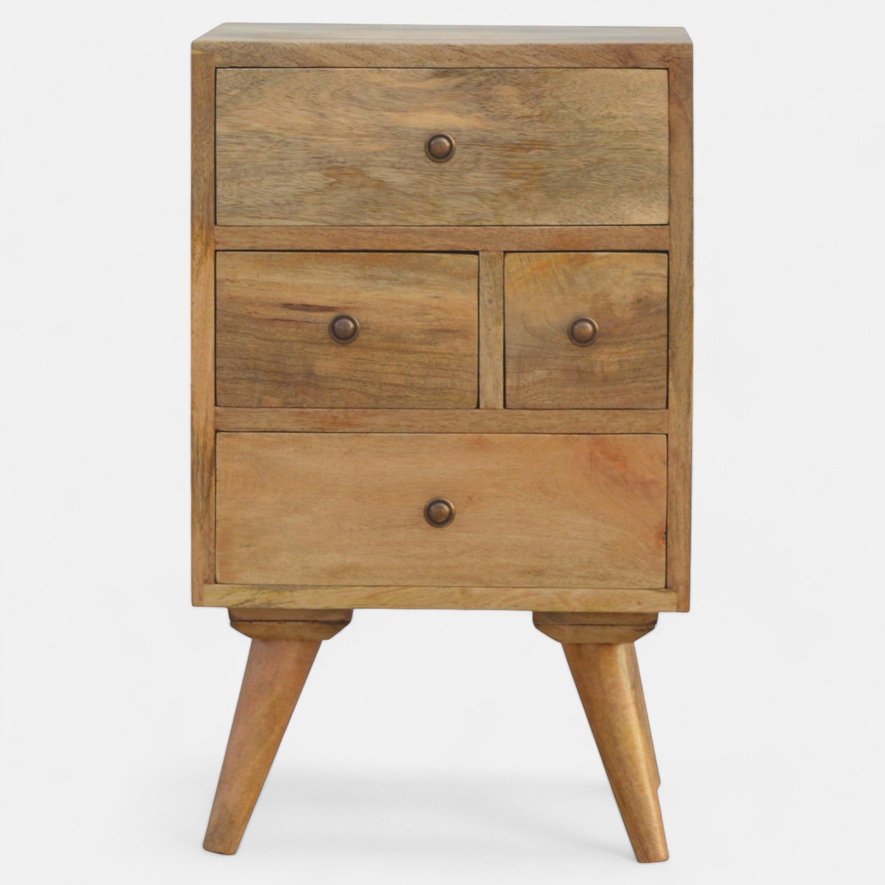 This beautifully designed bedside is constructed from 100% solid mango wood and has fine, smooth oak-ish finish. Endlessly versatile, this bedside table makes a perfect stand for nibbles, drinks or a lamp. Useful storage space is available with 4 drawers and a decent sized top. Other features include Nordic style legs and shiny knobs for the drawers.