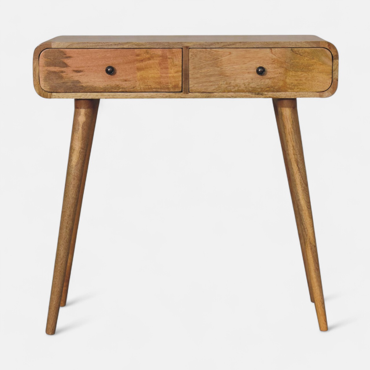 This simple, elegant console table has beautifully curved edges to fit perfectly in any living space, this 100% solid mango wood unit has been built with sustainably sourced timbers and has two drawers to help you keep your home organized by storing away any little household objects. It has shiny knobs and has a fine oak-ish finish with 4 Nordic style legs.